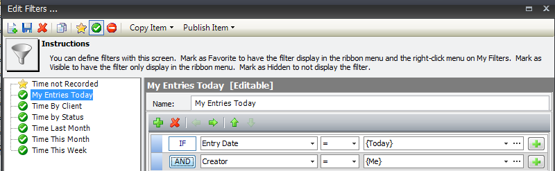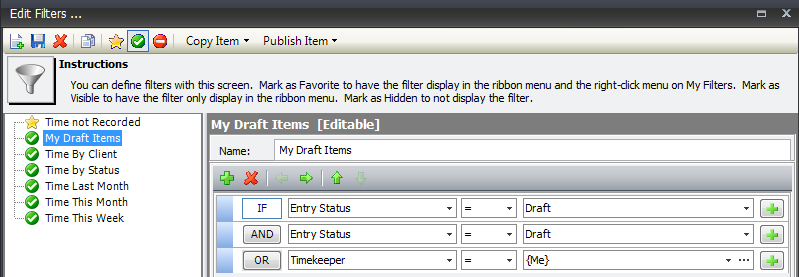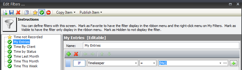 This statement results in all entries where {Me} is the timekeeper. The value {Me} is pulled from the system and is equal to the person is who is currently logged in. This means that the filter could be published for all to use, since the value {Me} would automatically change based on who is currently logged in.