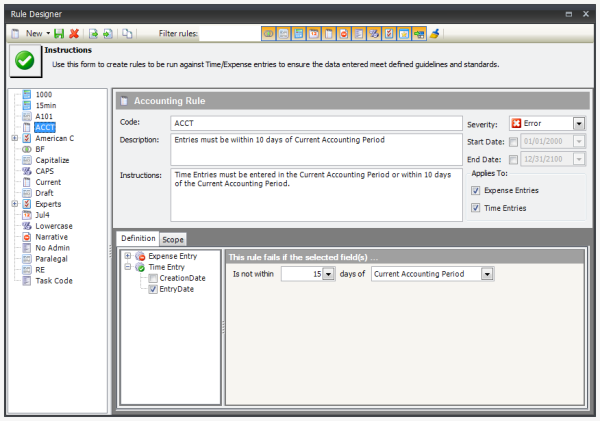 New Accounting Rule - This rule can be used to assure that time or expense entries are not dated within a certain number of days in the current Accounting Period or Accounting Year. For example: