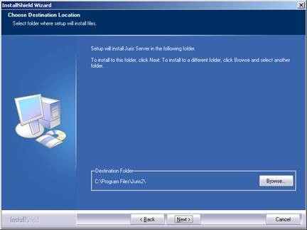 3. The path window that appears will allow you to determine the location where the application files will be installed.  This will default to C:\Program Files\Juris but may be changed by clicking the Browse button.   Once the path has been selected click the Next button to continue. See Figure 3.0