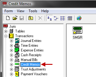 - Open Juris>Transactions>Credit Memos. See Figure 1.0