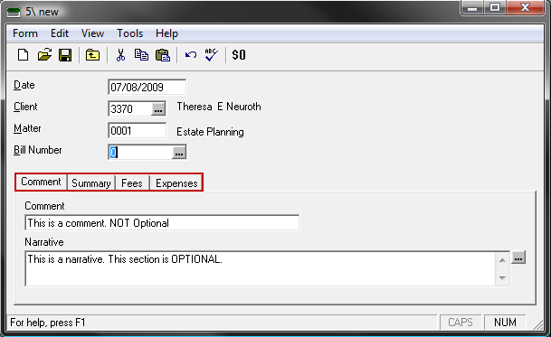 Tip: The Summary, Fees and Expenses tab allow the adjustment to be applied in a particular manner. For example, if a $500.00 adjustment is applied to fees on the Summary tab, the system will allocate that amount to all timekeepers on the bill. If the user elects to go to the Fees tab, they may apply that $500.00 adjustment to a particular timekeeper, if desired. Both positive and negative adjustments may be made. For example, a negative adjustment may be made on one timekeeper and a positive adjustment in the same amount made to another timekeeper in order to move the A/R from one timekeeper to another.