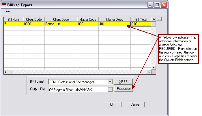 Once all required custom field information has been supplied, that bill will no longer be shown in yellow in the Bills to Export screen. This information will be stored to a matter note card in Juris so that subsequent bills exported for this matter will not ask for this information, it will be pulled from the note card automatically. Please keep in mind that if only optional custom fields exist for the format, the row will not turn yellow. It is recommended that when using a new format, click the Properties button to make sure no optional fields are available that you may wish to utilize before attempting to export the bill.