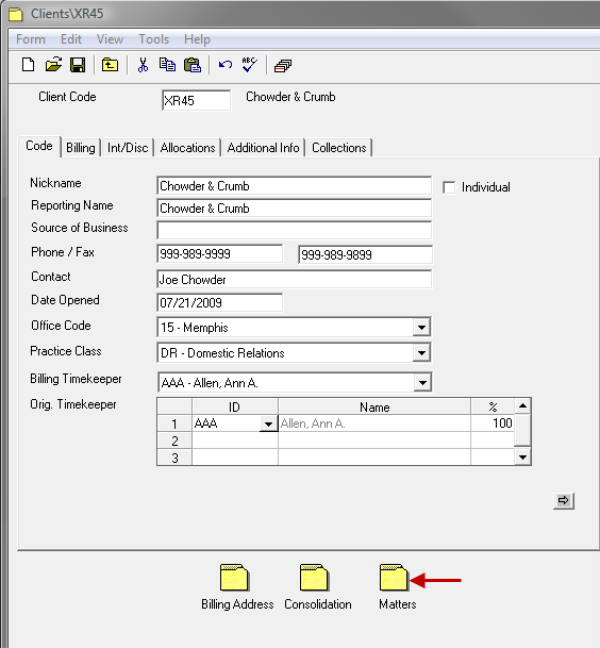 - Many of the default values supplied on the following tabs are pulled from the selections made on the related Client form. These defaults may be changed to any valid value as applicable to the individual Matter.