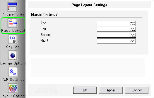 The Page Layout tab is the location where the page Margins can be established. These margins will apply to the Bill Format and all optional components that may be added, such as Banner Page, Cover Page, etc. Margins can be shown in Twips or Inches as defined in Layout Options.